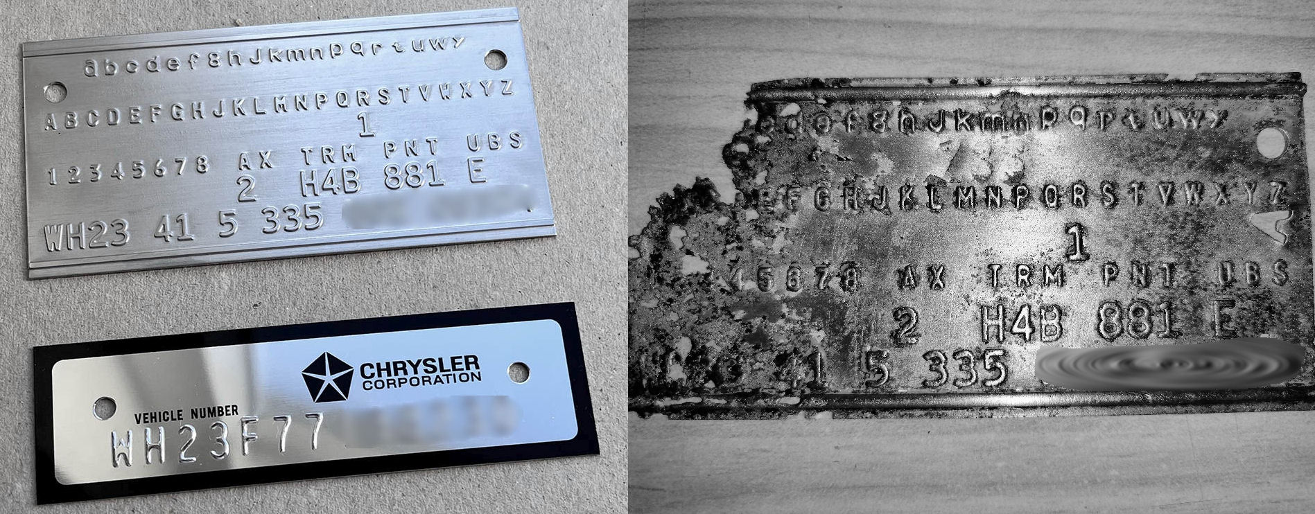 Da ich mich ja gerade im Aufbau des Coronet befinde und der Vorbesitzer in den USA üble Dinge mit dem Lack (unfassbare Silikonkrater, üble Läufer usw.) gemacht hat und auch die VIN Plate - keine Ahnung - mit der Flex bearbeitet hat, war die Überlegung, ob es was im Bereich der Reproduktion gibt.